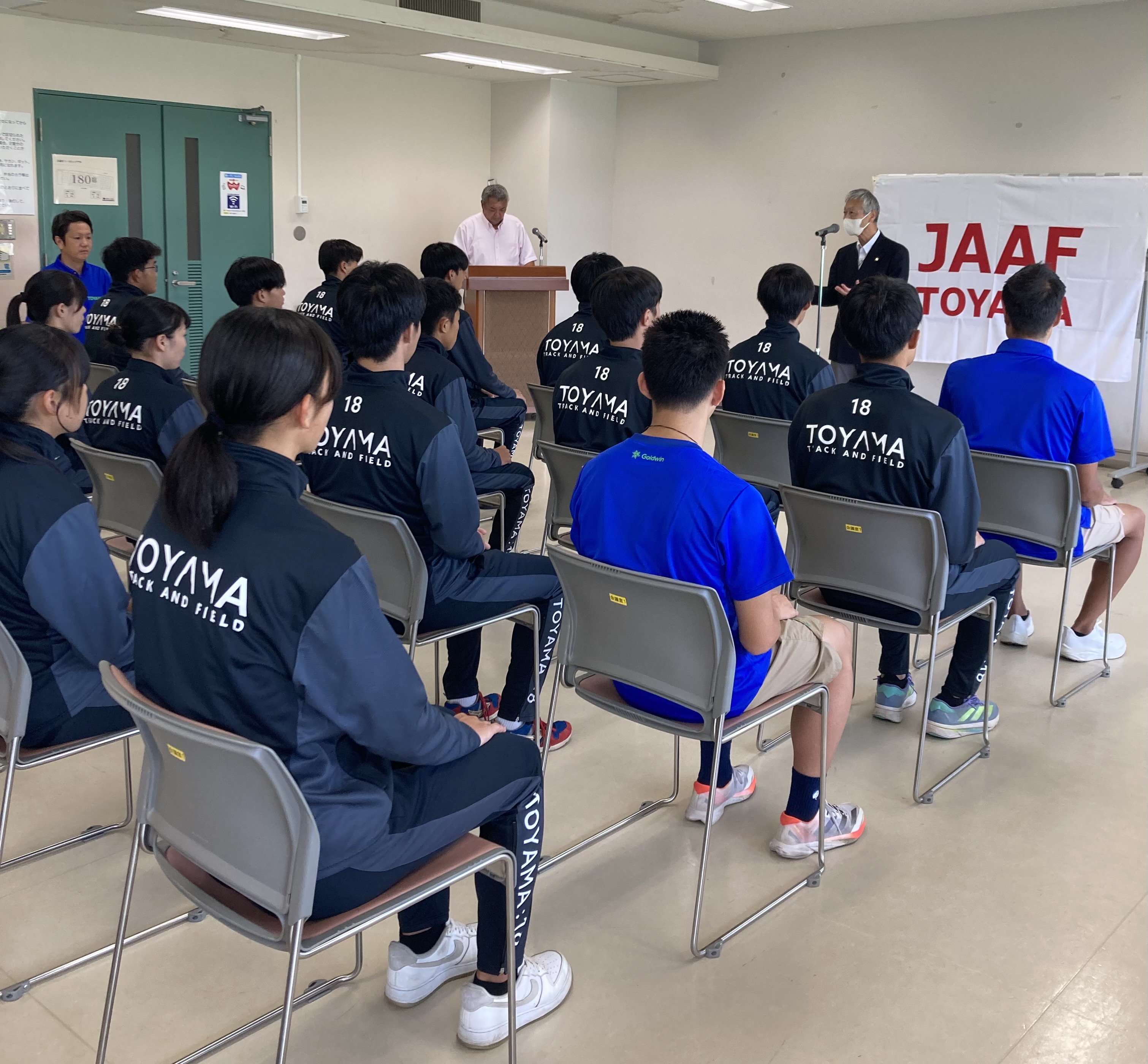 県陸上競技協会副会長から「体調を崩さないよう、本番は練習の成果を出してください。」また、県スポーツ振興課課長から「練習で培った成果を発揮し、県民に元気と感動を与えてください。」と激励の言葉をいただきました。